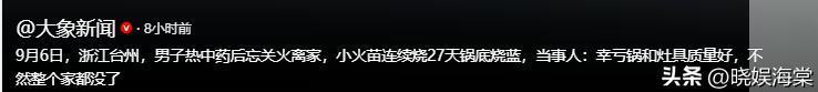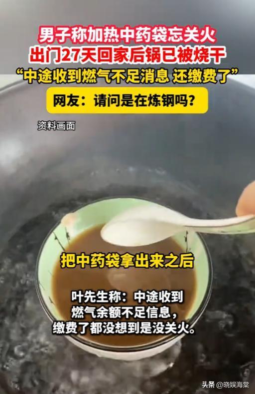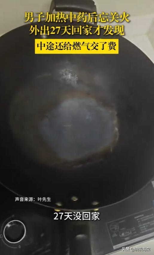 信息来源:@大象新闻·8小时前:9月6日,浙江台州,男子热中药后忘关火离家,小火苗连续烧27天锅底烧蓝,当事人:幸亏锅和灶具质量好,不然整个家都没了