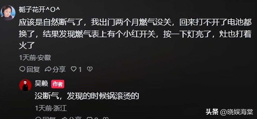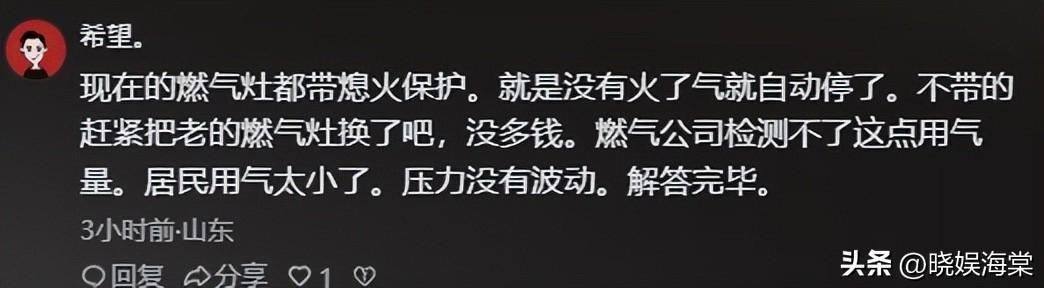 还有网友表示,是不是燃气欠费自己就断了,自己曾经也两个月燃气没关,回来发现打不开电池也换了,燃气表开不开,结果叶先生表示没断气,发现的时候锅还是滚烫的。