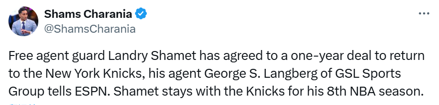 尽管有多支球队对沙梅特表达了兴趣,但上赛季效力尼克斯期间,沙梅特十分认可球队的更衣室氛围,且渴望留在队中冲击总冠军,这最终促使他选择回归。
