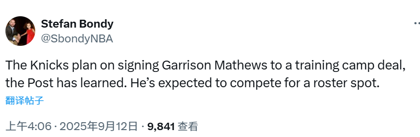 至于尼克斯队将签下的另一位自由球员加里森-马修斯,确定得到的是一份训练营合同。Bondy表示,马修斯有望通过训练营竞争尼克斯队的正式阵容席位。作为拥有6年NBA经验的老将,他已不再符合双向合同的签约资格。