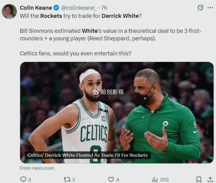名嘴比尔西蒙斯就认为火箭队可以等到12月15日,NBA交易市场开启以后做交易,交易对象就是凯尔特人的德里克-怀特。在塔图姆遭遇伤病报销之后,凯尔特人为了避税已经开始售卖主力,除了杰伦布朗和塔图姆,其他都可以交易。怀特是火箭队主教练乌度卡喜欢的球员之一,在凯尔特人执教过怀特,所以引入怀特也符合火箭队的战术。